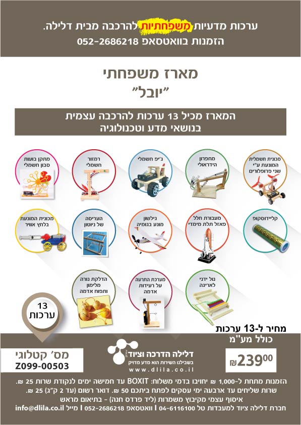 המארז מכיל 13 ערכות להרכבה עצמית בנושאי מדע וטכנולוגיה,